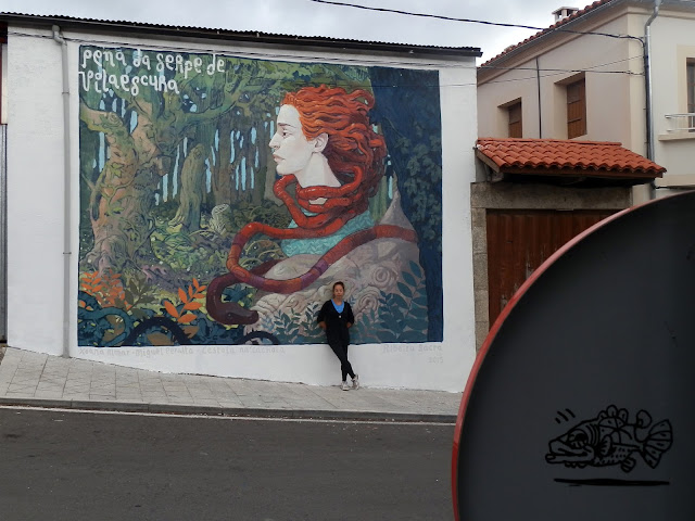 Miguel terminó el mural en Quiroga (Lugo) tras tres días de trabajo intensivo. Representa a una lavandera, una criatura mitológica que vivía bajo el agua en el río Sil y se dedicaba a limpiar y pulir las pepitas de oro del río. Aquí dejamos la leyenda que da origen a estas criaturas: