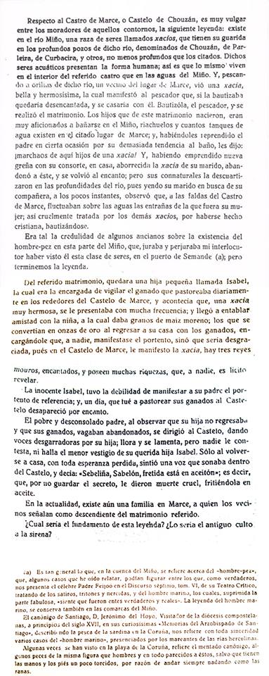 Río Sil Nunha tarde de outono atopou nun dos seus paseos un cazador mozo e lanzal, que viña de cazar un corzo coa súa baésta. A doncela, cuxa fermosura era, segundo se conta a "dunha fada", deuse a coñecer como pertencente ó castelo de Quiroga, mentres que o mancebo fíxoo como vasalo do señor de Osorio, de Castro Caldelas. Así e todo, a beleza de ámbolos dous mozos fixo que se namoraran nese mesmo instante o un do outro, acordando manter novos e apaixonados encontros.